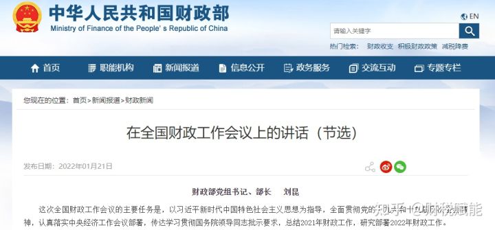 2022年1月21日,财政部党组书记、部长刘昆在全国财政工作会议上的讲话: