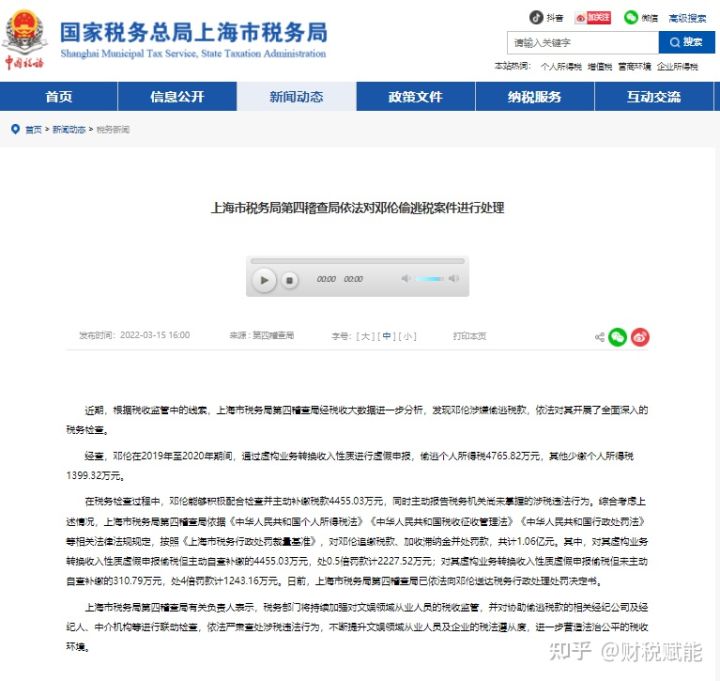 今日,上海市税务局第四稽查局根据税收监管中的线索,经税收大数据进一步分析,发现邓伦涉嫌偷逃税款。